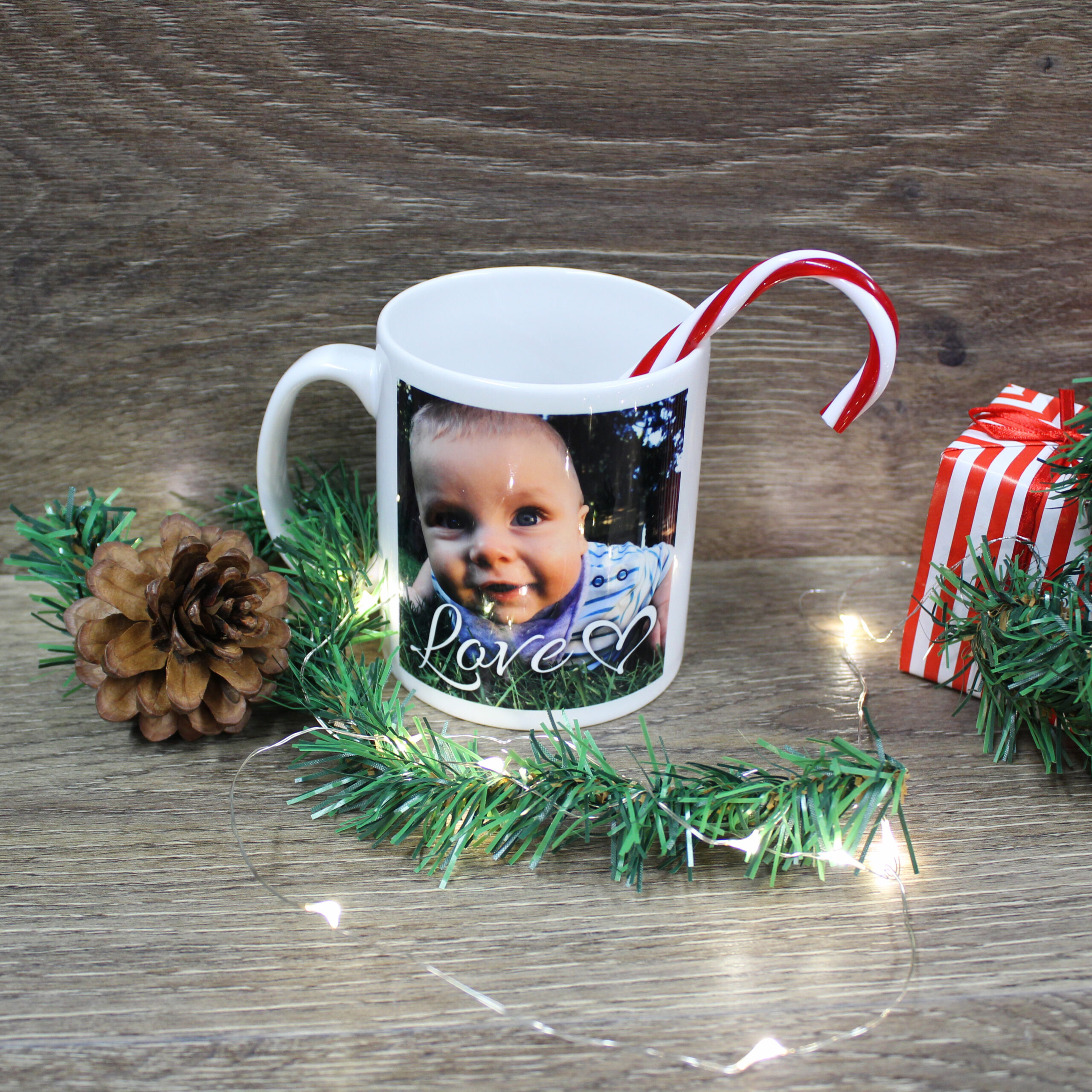 Love photo mug is a lovely gift displaying the word love with a heart. You can add any photo of your choice to make this a unique and special photo gift for a loved one.